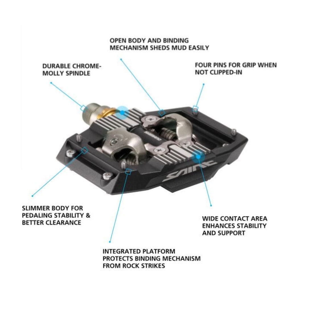 - Double-sided durable alloy pedal body protects the SPD mechanism from impacts whilst a low profile design lowers the stack height